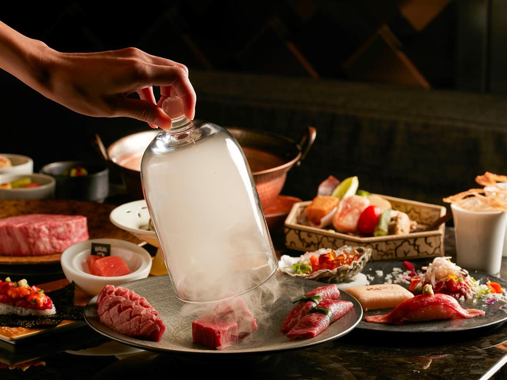 冬燦套餐最受矚目的就是「本日嚴選三拼」,使用「日本A5菲力角切」,是一整頭牛最高級且口感最柔軟的部位,並搭配蘋果木靜置煙燻,將煙燻味緩緩融入肉中,更能將菲力的精華甜味鎖在其中,隨著表面的酥脆口感一同入口,實為絕美滋味,還有市面上罕見格紋切花刀法的「澳洲厚切牛舌」與「日本A5鹽蔥燒」;而「本日嚴選牛排」特別選用菲力「夏多布里昂」部位,一頭牛不到1K,極為稀少珍貴,外表油花均勻且細緻,口感柔嫩不油膩,佐上山葵泥、柚子胡椒、泡沫醬油、鹽之花享用;爲了使餐點更有季節感,料理長將「季節牛肉鍋」使用蛋白製成泡沫狀,呈現雪的視覺感,因此又稱為雪見鍋,湯頭則是使用京風白味增,加上豆漿,使整體風味更溫和,搭配涮5分熟的後腿肉一起食用,堪稱絕妙享受。