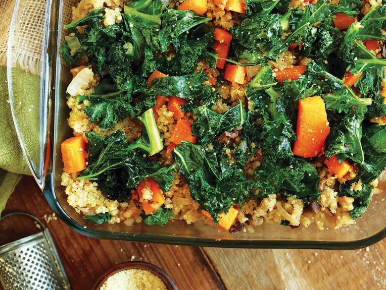 Step 9將烤箱溫度調至華氏190度C。在準備好的烤皿裡放入藜麥、堆上炒蔬菜、羽衣甘藍和奶油南瓜,稍加混合。