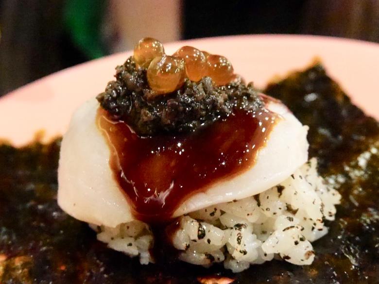 「松露干貝盛」散壽司獨門調製的松露醬點綴在炙燒過的干貝上,更有鮭魚子增添視覺與鹹香口感,以散壽司呈現,除了能吃到鮮甜干貝外,最後在舌尖與鼻腔間更有松露香氣餘韻不絕。