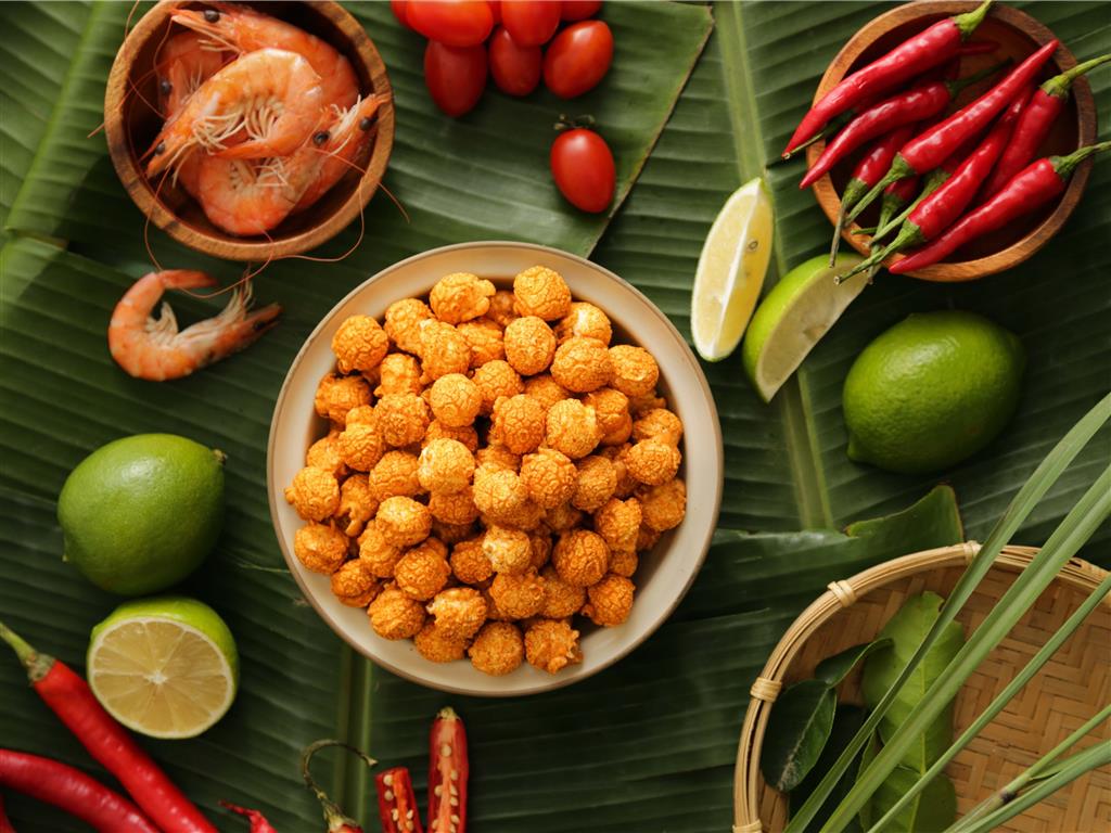 星球工坊延續2019年「今夏辣一波」的主題,加入熱帶國情元素,以異國泰式料理為概念,推出爽口開胃的「泰式酸辣爆米花」,選用泰國檸檬草、香茅搭配多種香辛料調製的酸辣粉,一入口就能感受到酸辣帶勁的味道,最後留在口中則是帶有淡淡的草本與檸檬清香,酸、辣、鹹、香一應俱全,就像是道地的TOM YUM冬蔭湯一樣,富有層次和南洋風情。
