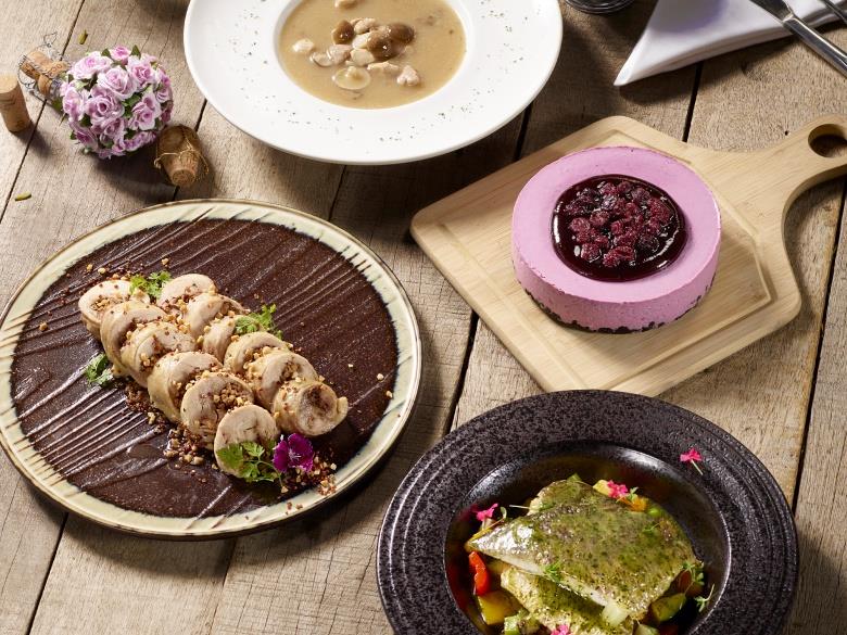 在西式餐點的部份,則是走養生系料理,包含法式風格調製而成的「雞丁野菇濃湯」(550元)、低溫烹煮且含膳食纖維的「堅果雞捲佐藜麥」(599元),還有採用食補聖品台灣鱸魚的「燜煎鱸魚佐荷蘭芹奶油醬」(749元),飯後再嚐嚐入口即化的「藍莓生乳酪蛋糕」(699元),將是極致的犒賞大餐。