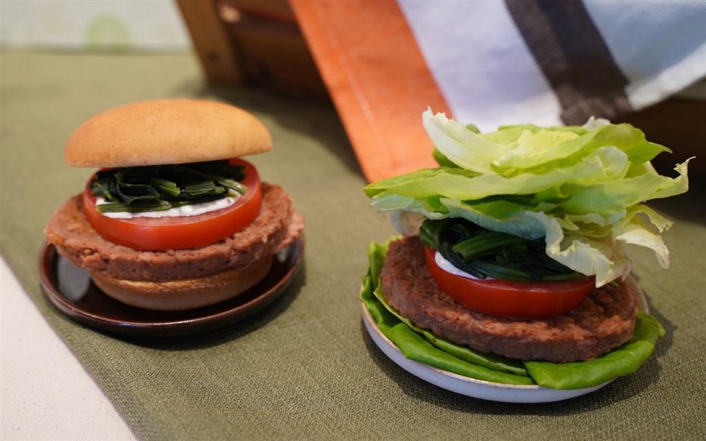 「蔬菠摩力堡」以日本獨創技術栽種之大豆製成100%植物肉漢堡排,保留更多大豆營養,不只鮮甜,口感更Q彈有勁。(圖片來源:摩斯漢堡提供)