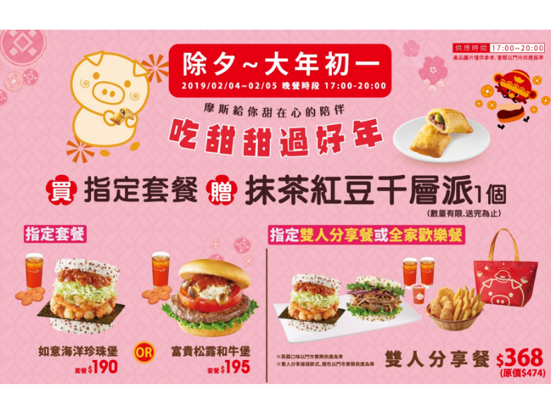 摩斯漢堡歡慶2019迎新年、添新意,於2019年1月19日一口氣祭出11款期間限定新品,讓民眾可在年假期間約親友一起享受11款新品美食,有「如意海洋珍珠堡」、「富貴松露和牛堡」、「金旺鱈魚堡」、「義式茄汁薯條」、「黃金地瓜薯」、「義式蔬菜燉湯」、「草莓蒟蒻茶歐蕾」、「草莓橘子氣泡飲」、「牛奶糖慕斯」、「紅葡萄柚蒟蒻」、日本原裝進口「長崎蜂蜜蛋糕」,消費滿200元送一張抽獎券,有機會可獲得萬元摩斯卡等大獎。