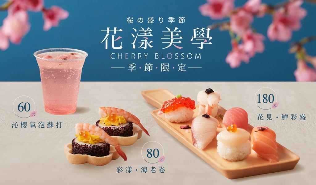 「櫻花爛漫幾多時?柳綠桃紅兩未知。」在春櫻細雨紛飛落的季節裡,「点爭鮮」於2019年3月5日至5月7日止推出「花漾美學」春季限定系列,共3款新品上市:「花見‧鮮彩盛」、「彩漾‧海老卷」、「沁櫻氣泡蘇打」,以粉嫩春櫻的意象化作各種壽司小點,淡粉紅色的氣泡蘇打酸甜口感更是猶如初戀滋味。