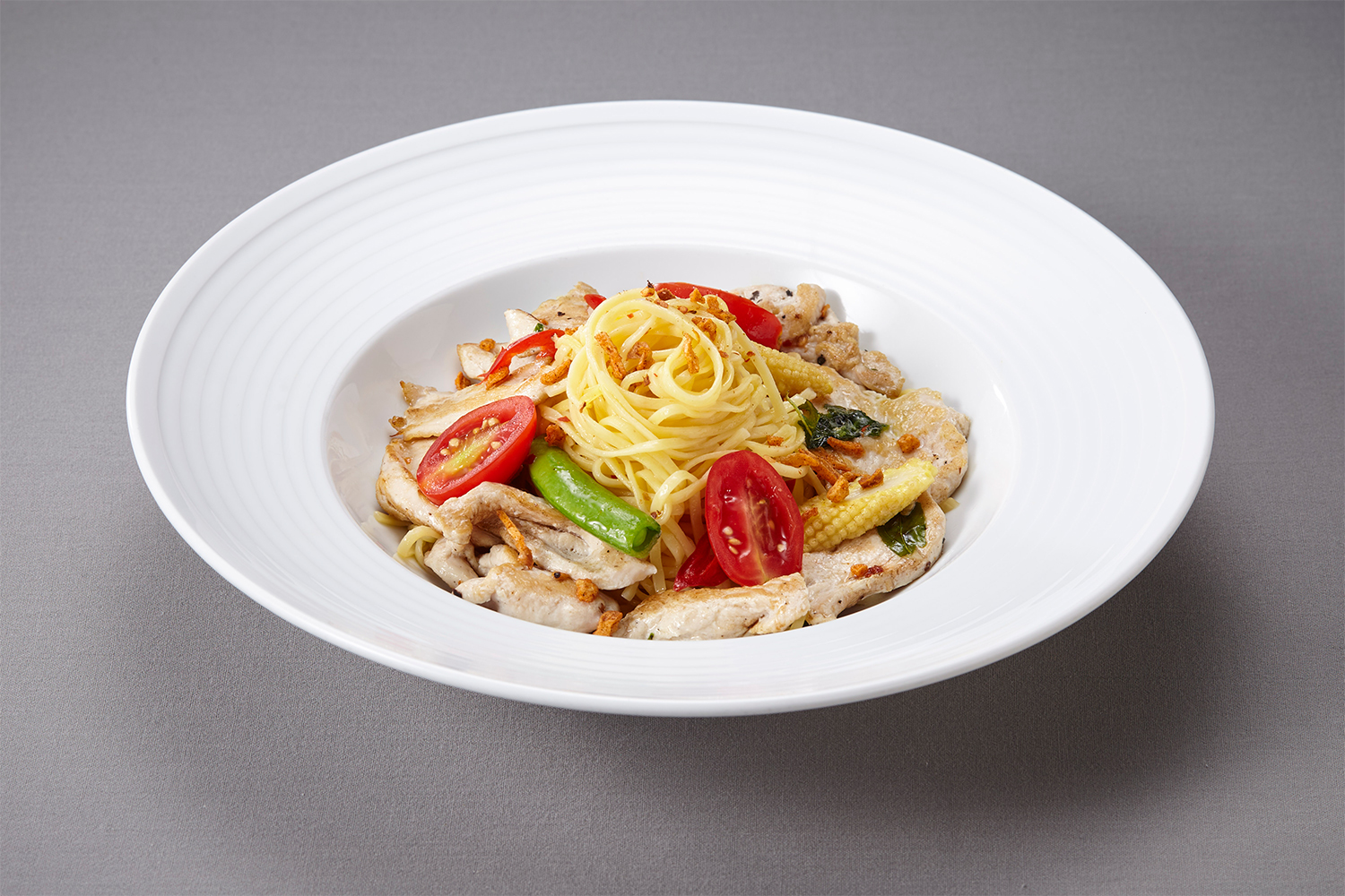 香蒜辣雞肉細扁麵,蛋白質含量高,具高膳食纖維特性,有助於新陳代謝,口感更提升。(圖片來源:誠品行旅提供)