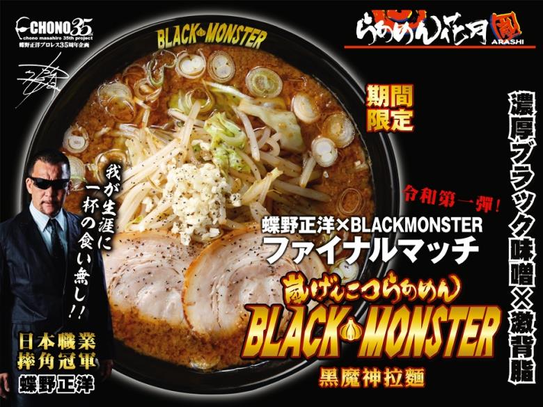 日本原汁原味的花月嵐拉麵,2019年5月30日將推出由日本職業摔角冠軍「蝶野正洋」代言的「黑魔神拉麵 Black Monster」。 蝶野正洋於1984年10月於新日本職業摔角團體出道,並以驚人之姿奪得每年日本夏季舉辦的「G1 Climax」優勝冠軍5次,是目前最多優勝紀錄的選手,並以黑色魅力形象在職業摔角稱霸。