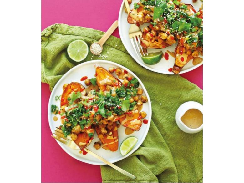Step 5組合時,將烤好的地瓜排在上菜盤裡,輕輕按壓中央,形成一個小凹陷。舀入鷹嘴豆和醬料,再撒上選取的配料。