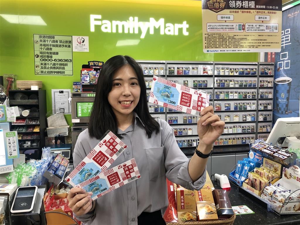 全家便利商店自2020年8月19日推出「聰明消費卡」,每張售價200元,民眾可使用現金、振興三倍券、電子票證、電子支付購買,內有5種額度購物金,限量20萬組。