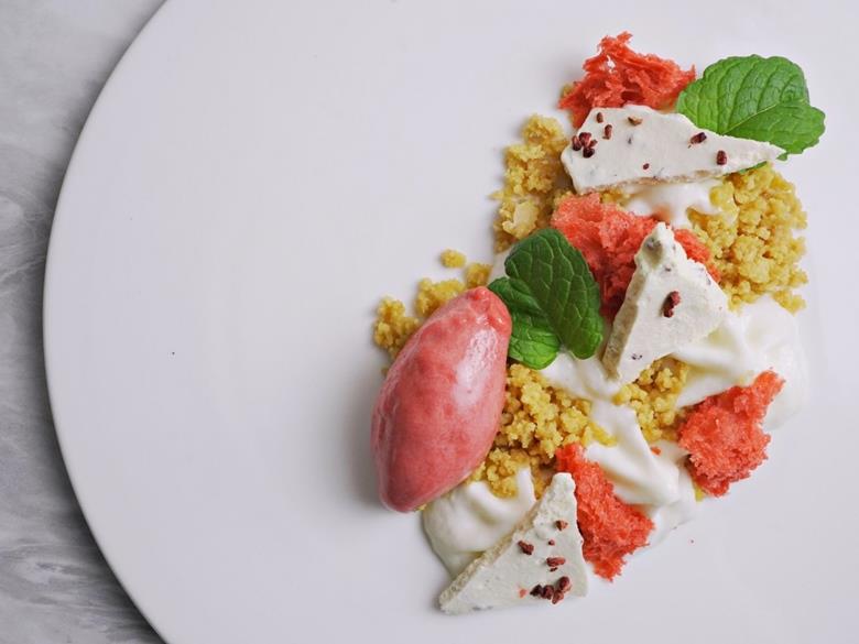 前菜食用完畢,就進入第一道主菜「甜蜜」,Spice以鵪鶉的3個部位分別以煎、炸、燉 不同的料理手法處理,搭配醃漬洛神、蜜金棗及自製蜂蜜柳橙醬,讓你回想起戀愛中甜甜蜜蜜的片刻,第2道主菜「磨合」,選用中式料理蠔油牛肉為主題,但卻以西式手法做詮釋,中西的碰撞代表著情侶間的衝突,但搭配出來的協調口感,也象徵著磨合的過程,都會讓兩個人成長出更好的樣子,最後一道甜點「下一幕」,一端上桌就會看見一個巧克力殼,敲破後的下一幕就會看見鮮奶油及莓果雪酪,粉紅美好的樣子,也象徵著與另一半甜蜜的「下一幕」。