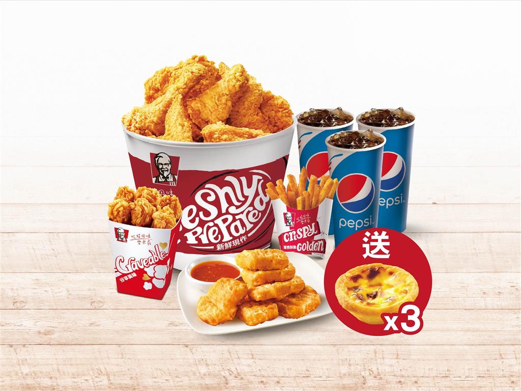 購買派對B餐六塊雞組合即贈原味蛋撻3個,肯德基好康優惠千萬別錯過。(圖片來源:肯德基提供)