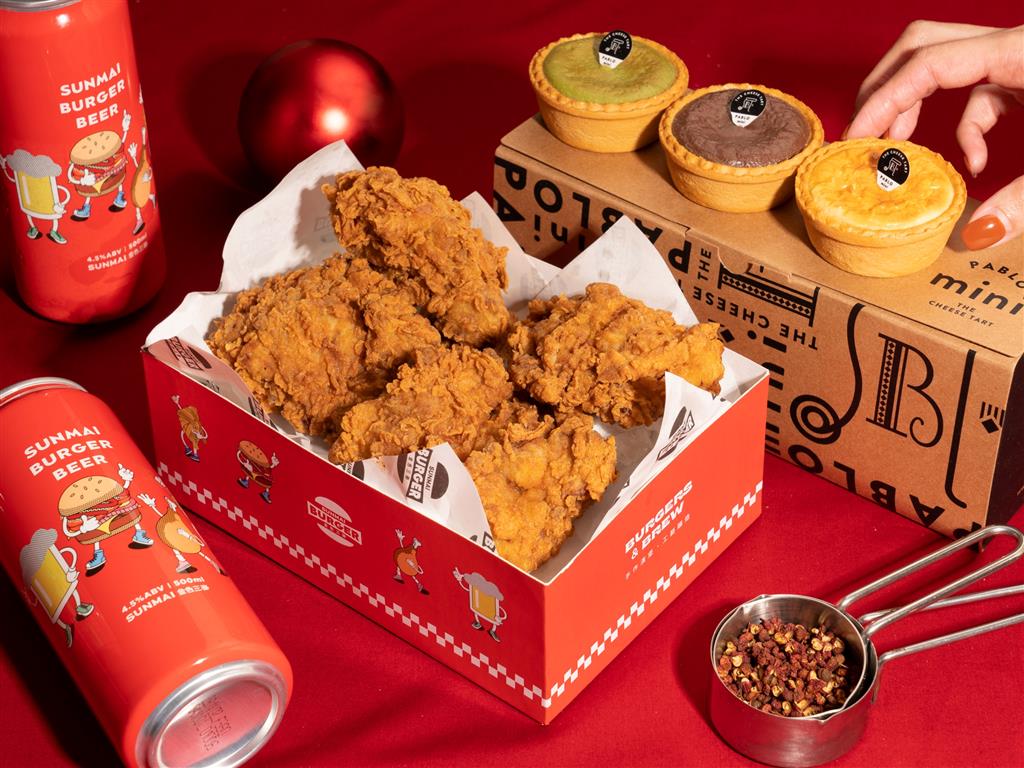 「青花椒爆脆雞+半熟起司塔雙強配」包含4入麥漢堡爆脆雞(口味任選),「原味爆脆雞」以獨門比例粉漿、秘方醃漬炸出去骨雞腿的香酥脆口、柔嫩口感與肉汁;「青花椒爆脆雞」口味以青花椒烘托花椒的辛香與麻感,迸發雙椒加乘香氣!組合搭配3款PABLO迷你半熟起司塔:有加入大量杏桃醬的經典原味、濃郁且甜中帶苦的巧克力口味,以及香氣迷人的抹茶口味;隨餐更加贈兩瓶麥漢堡門市限定500ml罐裝啤酒,讓聖誕跨年期間的派對氣氛加倍濃郁!