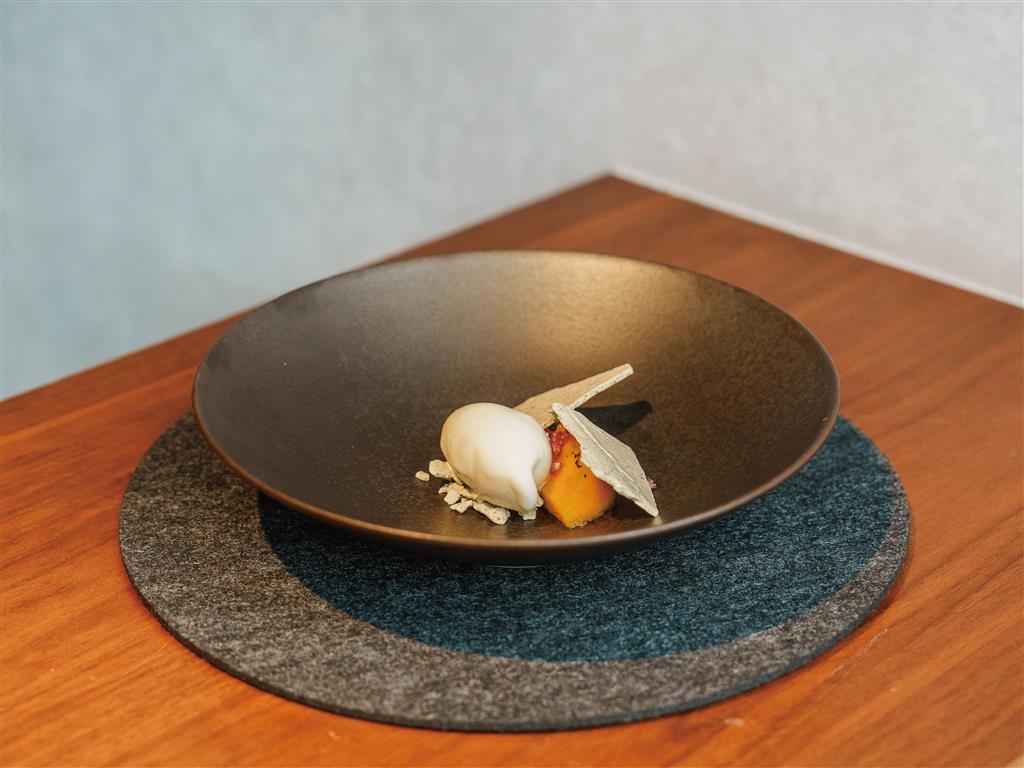 甜點《水蜜桃|冰淇淋|茉莉花》則以嘉明牧場所出產的濃郁鮮乳去製作出帶有天然花草香和堅果的冰淇淋,旁邊搭配當季的拉拉山水蜜桃以及茉莉花蛋白餅,呈現出春夏之際獨有的清爽美味。