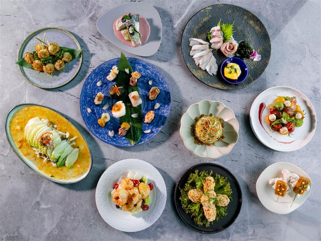 迎來春天,「饗A Joy」以蘇軾的《浣溪紗》及白居易的《早春》為發想概念,將野菜、嫩芽結合時令,打開春季味蕾的記憶寶盒。在沁波區,資深西廚研發主廚魏景振大玩台灣懷舊童趣,其中「金沙綴綠筍串」將豬血糕概念重新轉譯,將當季新鮮竹筍串上竹籤,沾裹醬油、沙茶跟糖調製而成的醬汁,最後撒上花生粉,鹹甜口感老少咸宜。魏景振還為「饗A Joy」研發了桂花起士拌入「聖托里尼花園沙拉」,新鮮的綜合彩色番茄加上半風乾番茄,兩種口感搭配揉合著濃郁花香的起士,淋上玫瑰紅酒醬,清爽又帶點微酸微甜的口感,相當值得一試。而然然區的「鱸魚菲力佐紅天鵝絨醬」,淋上獨特的紅天鵝絨醬,配上炙燒過後的蘋果絲瓜及老薑麻油煸炒過的紅鳳菜,口感豐盈對味。