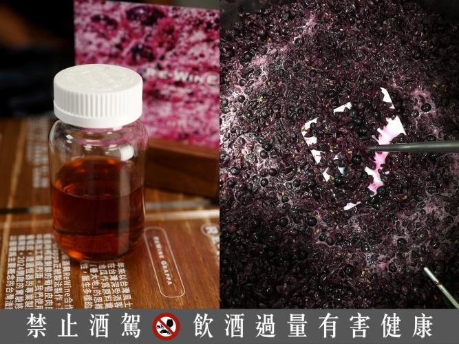 2025年ReWine計畫發表威石東木杉橘酒渣釀白蘭地,並將其中副產物威石東葡萄皮轉化為風味原料,開發一系列「喫的葡萄酒」。(圖片來源:喝自然提供)