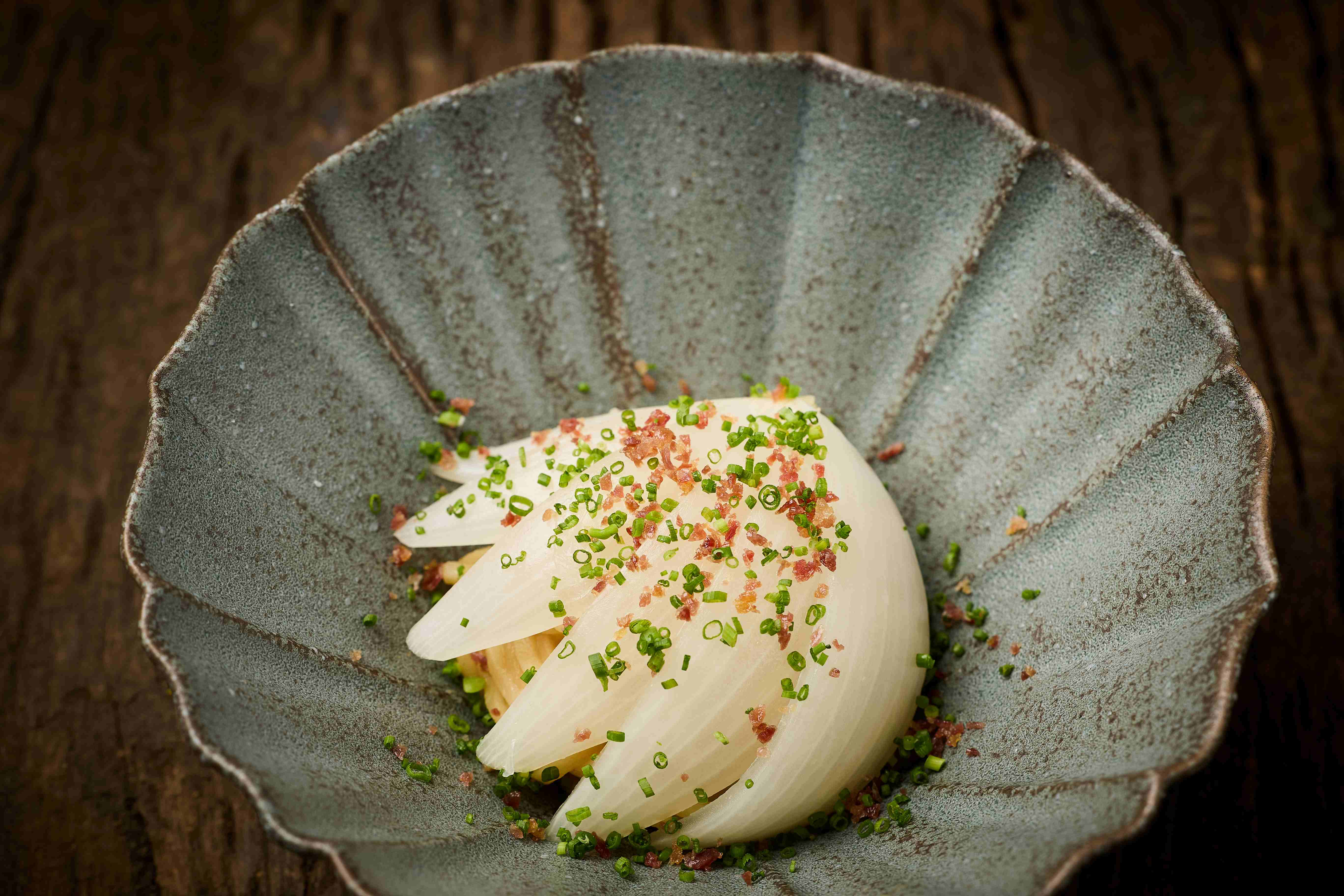 冬蔥糖度高、香氣突出,以煎香蔥白、蔥綠煉油,最後以伊比利火腿煙燻香做收束。