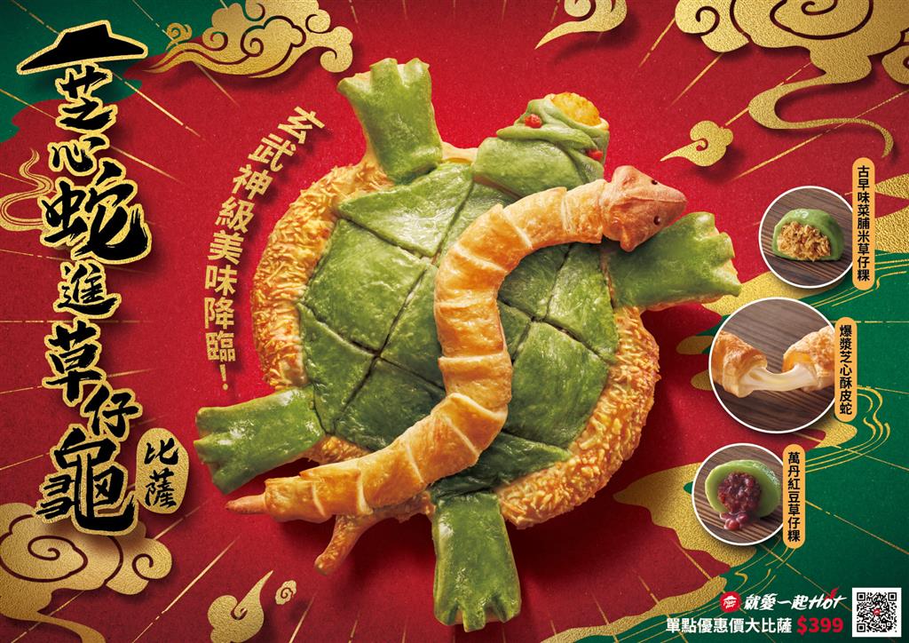 創意無限的必勝客2024年推出神還原烏龜、蛇造型的「草仔龜比薩」和「芝心蛇圈圈」,不僅擄獲眾多饕客的胃,更讓廣大網友敲碗希望兩者合為一體!這次必勝客回應網友期待讓龜蛇「合體」,推出靈獸「玄武」造型的「芝心蛇進草仔龜比薩」,更請到「保庇天后」王彩樺加持,要讓大家有吃有保庇!鹹甜各半的「草仔龜」上能吃到香噴噴的菜脯米、飽滿的顆粒紅豆餡;「芝心酥皮蛇」更覆蓋層次分明的金黃酥皮,加上必勝客廣受好評的招牌芝心,鹹香、甜蜜、濃郁、酥脆等多重口感一次享受,讓人意猶未盡!「芝心蛇進草仔龜比薩」2025年3月24日前PK APP會員搶先獨家販售,外帶單點優惠價只要399元,限時限量販售,快來必勝客享受這好吃、好玩又有保庇的美味!