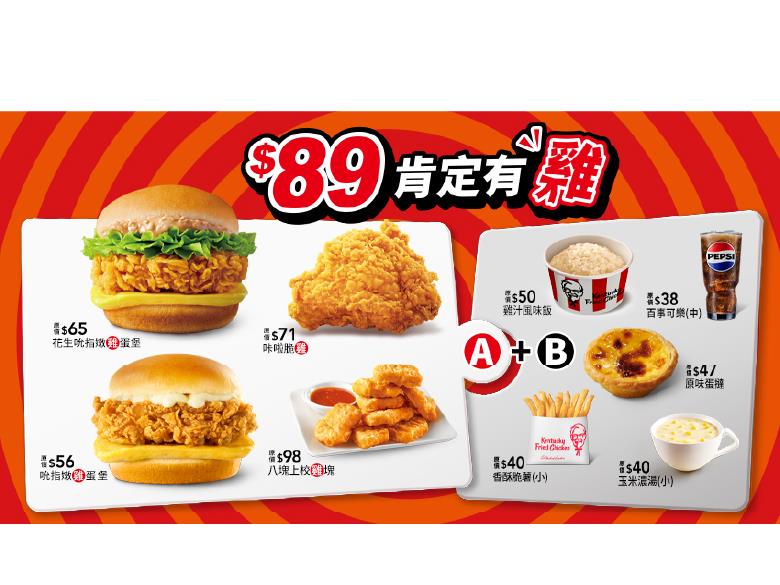 肯德基「$89肯定有雞」A+B組合全新升級!選擇更多樣、怎麼配都有雞!