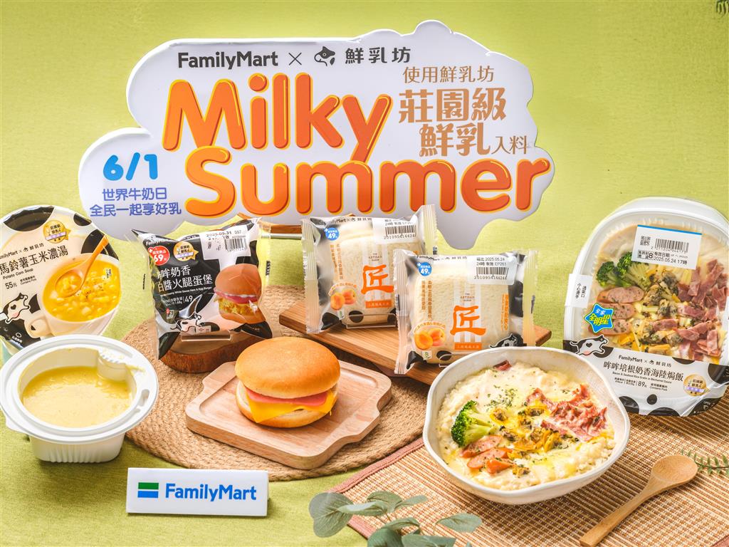 全家便利商店響應6月1日世界牛奶日,攜手鮮乳坊推出4款Milky Summer奶香鮮食新品,還有機會抽中鮮乳坊獨家周邊或萬元「全家」購物金。(圖片來源:全家提供)
