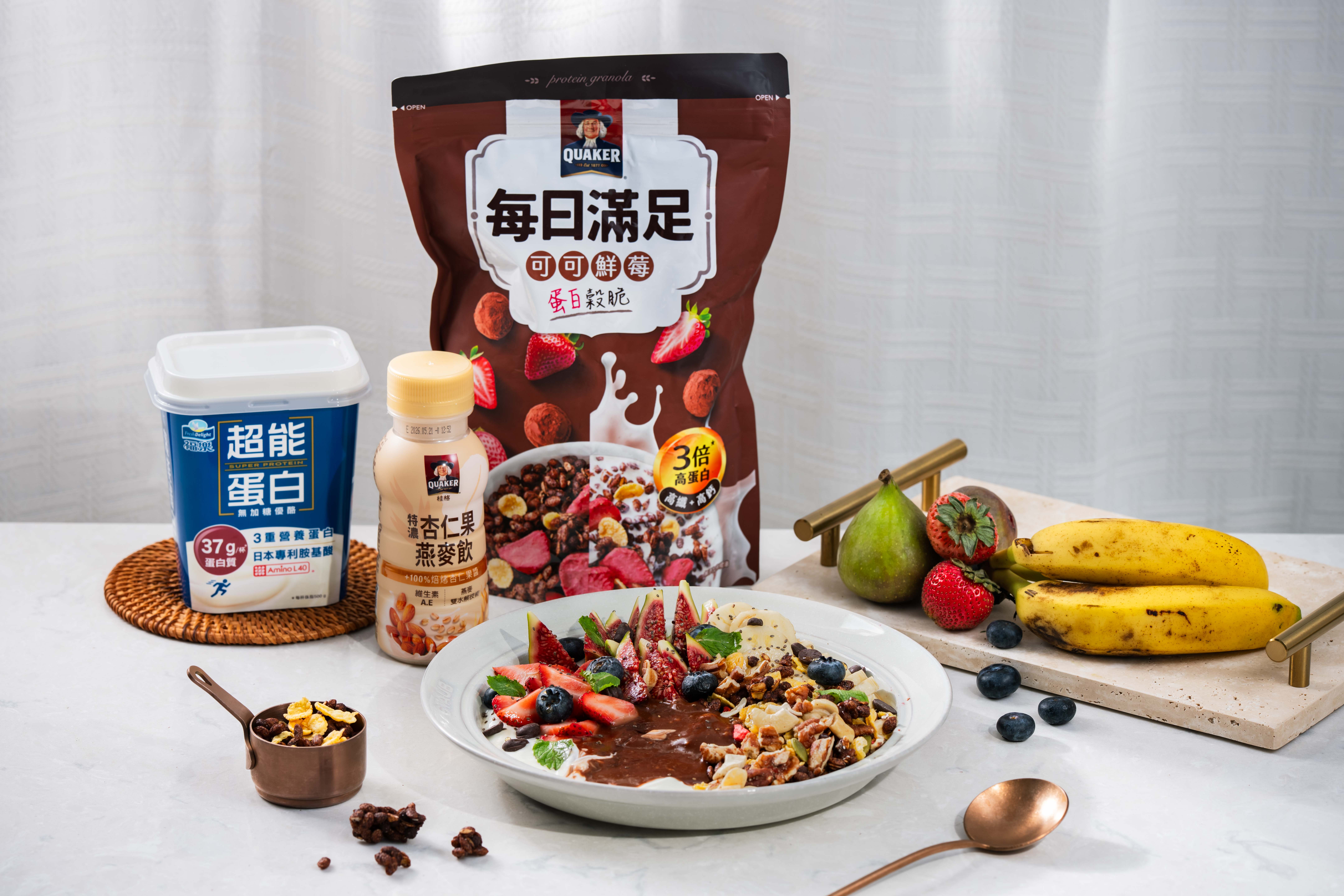 4、「優質蛋白質」食譜 超能蛋白莓果優格碗與可可杏仁醬:使用「福樂超能蛋白protein優酪無加糖風味」做為基底,撒上「桂格每日滿足蛋白穀脆-可可鮮莓」與新鮮莓果,搭配加入「桂格特濃杏仁果燕麥飲」的自製可可杏仁醬,一碗全面攝入「好醣、好油、高纖、優質蛋白質」等好代謝營養。