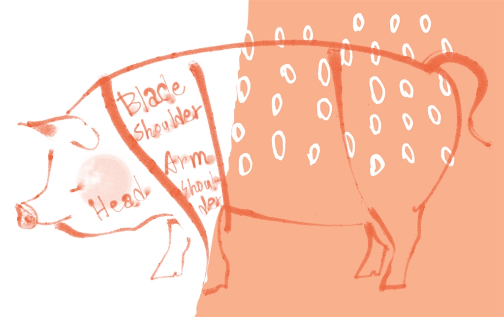 市面上不少豬肉被稱作「霜降豬肉」。這裡的霜降,是形容肉的油脂紋路分布細小均勻,就像是降霜或是大理石,最早是日本人用於形容牛、肉的說法。台灣人應用於美稱豬肉, 常被這麼稱呼的部位有:臉肉、嘴邊肉、兩頰肉、二層肉等等。台灣也稱作「菊花肉」、「雪花肉」。