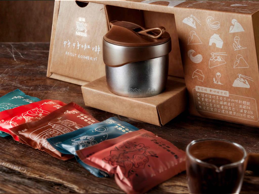 雀巢耗時15個月打造全球首創的「雀巢好好咖啡」,聯手成功大學工設系、在地企業旺騰實業,透過可隨身攜帶、重複使用的不銹鋼品飲杯、手沖壺和濾杯,取代一次性碳紙、濾掛耳包,100%可回收紙盒與咖啡濾渣,讓一杯咖啡實踐永續發展。