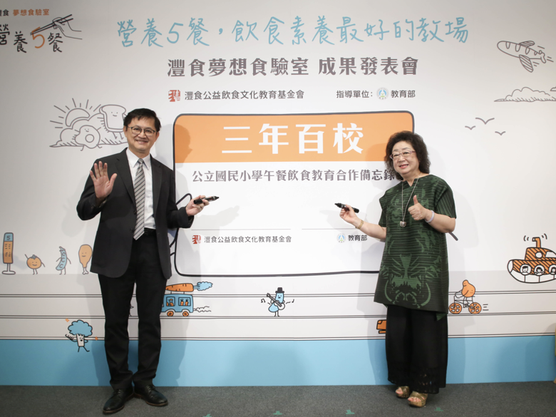 教育部次長范巽綠、新北市副市長謝政達、灃食教育基金會董事童子賢與侯文詠,以營養5餐為教育模組進行三年百校計畫,推動飲食素養教育。(圖片來源:灃食教育基金會提供)