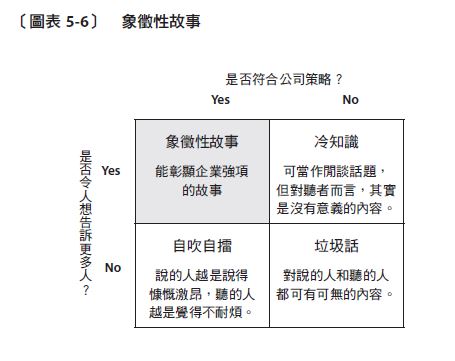 然而,對企業而言,最重要的不只是讓消費者聽了之後想告訴更多人,也不是只要令人想按讚就好,而是要透過這些故事,讓消費者可以從中了解企業的商業模式、營運機制或系統。這些故事與企業的策略直接相關,和那些純粹插科打諢的趣聞截然不同。因此,能為顧客提供卓越品牌價值的公司,多半都有這種能與商業模式、企業策略相連結的象徵性故事。