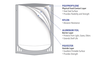 在好侍的官網對真空殺菌袋食品的科普介紹中,也展示了常見的殺菌袋包裝包材的結構。典型的包材由食品接觸側耐酸耐熱的聚丙烯層、中間阻光阻氣的鋁箔層、和外側提供保護強度、抗壓抗衝擊的PET材質層組成。