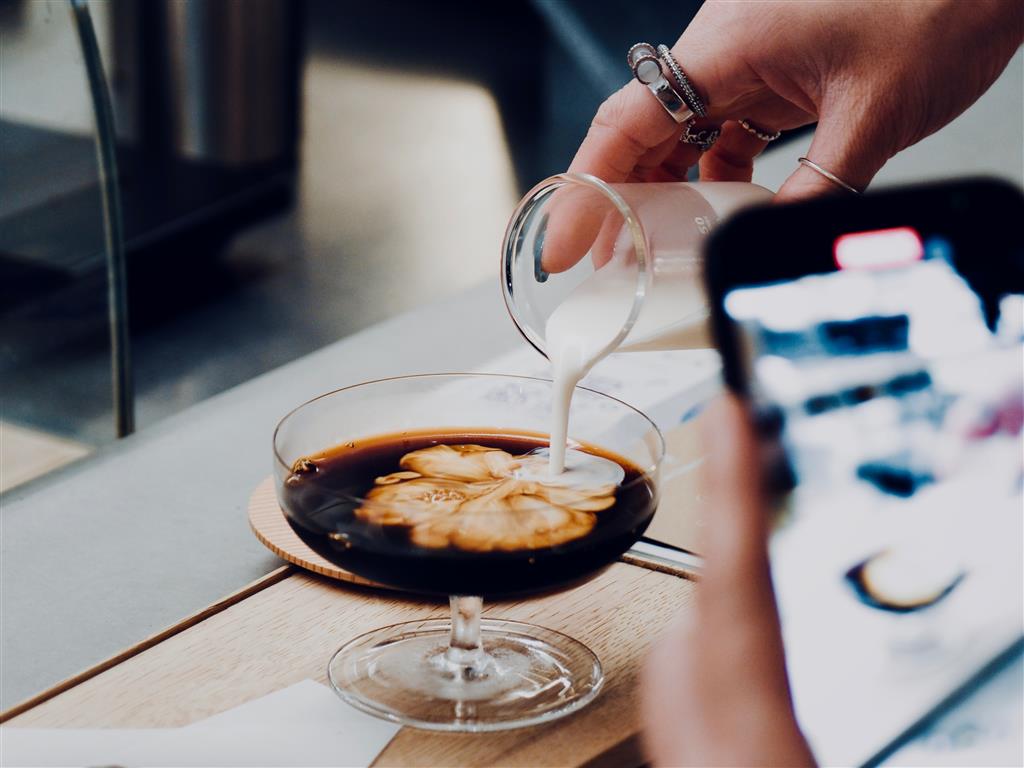 倒入鮮奶油的咖啡,表面會有如琥珀結晶的過程,是豐富的視覺饗宴。(李姵琦攝)