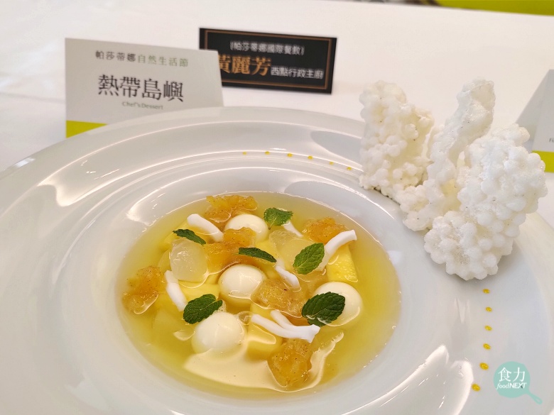 帕莎蒂娜甜點主廚黃麗芳於2018年就親自體驗進入鳳梨田間栽種與採收,對農民的專業與辛勤投入更是感同身受,她表示廚師必須經常跟著季節食材創作,因此採用在地栽種的金鑽鳳梨創作出「熱帶島嶼」甜點,藉由果肉到果心及成份特性,以天然鳳梨果凍、低溫烹煮的精華汁液,發揮多種層次的口感和香氣,呈現台灣南方及島國的食材特性。