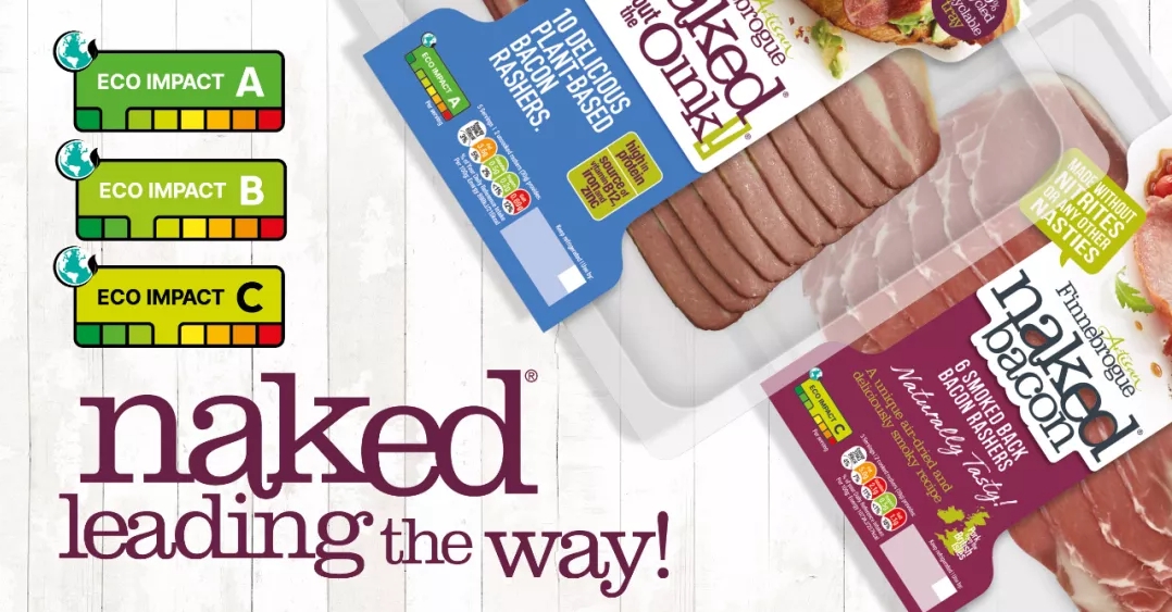 Finnebrogue旗下培根品牌Naked,在產品包裝上添加環境評分等標籤。(圖片來源:FBIF提供)