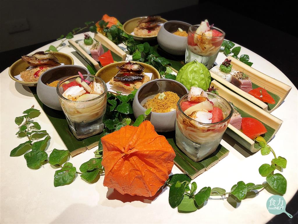 八寸「山里旬菜盛合」。每道菜上桌,都是花藝、陶藝與廚藝的精彩演繹。
