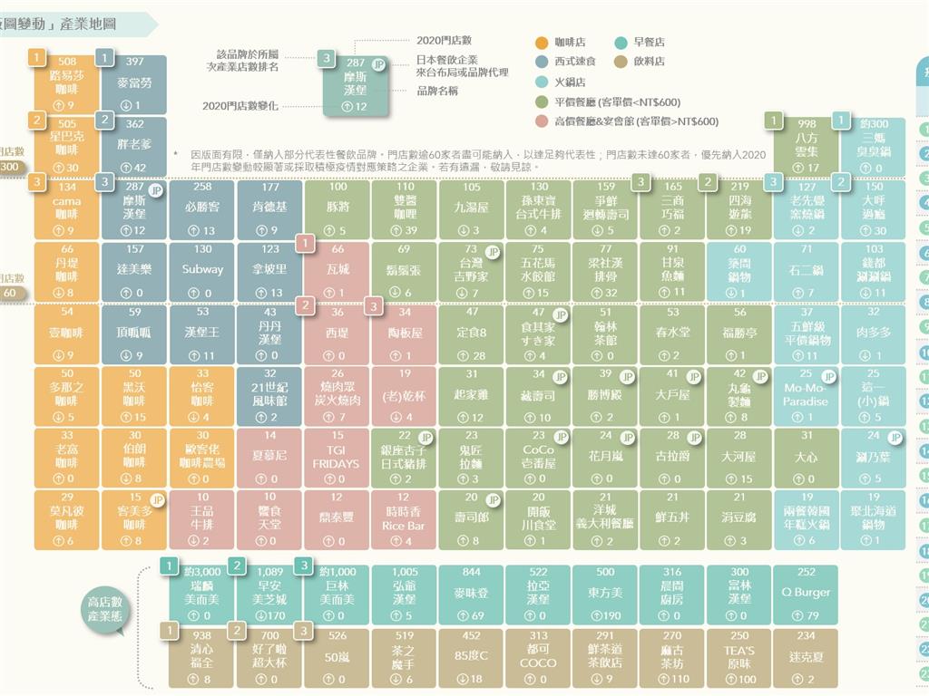 然而2020年以來持續壟罩的新冠疫情,對餐飲業形成少見的高強度壓力測試,企業在疫情下分歧的營運表現直接牽動著台灣餐飲業劇烈的版圖變動。因此,未來流通研究所爬取彙整台灣餐飲產業數據情報,繪製2020台灣「餐飲版圖變動」產業地圖,除區分不同餐飲服務型態外,進一步以緊扣規模經濟效益、品牌影響力與營收市佔率的門店數為劃分指標,搭配年度門店增減數量,透過資訊圖象呈現主要餐飲業者在疫情下的經營情勢變化,並歸納3項觀察重點,做為分析台灣餐飲產業的重要參考佐證。