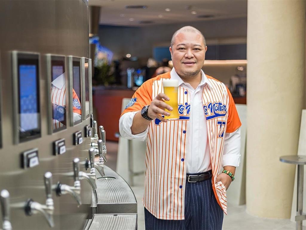 採訪這天,來到金色三麥旗下,位在大巨蛋遠東Garden City商場的新品牌SPORTS NATION主題餐廳,他自豪地介紹店內寬達8.3米的環狀螢幕,以及全球首座電子酒精交易所,裡頭的20種酒款採以量計價方式販售,就像股票一樣會隨成交量漲跌,充滿互動和娛樂性。