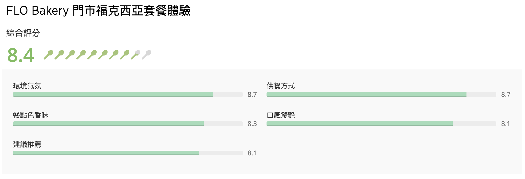 FLO Bakery 門市福克西亞套餐的試吃體驗券,得到總和評分在10分滿分中得到8.4分,環境氣氛、供餐方式、餐點味道、口感等,都是評分關鍵。(圖片來源:FLO Bakery 門市福克西亞套餐截圖)