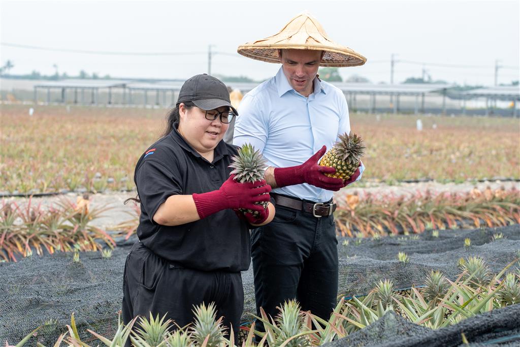 金鑽鳳梨果農何秉洋分享金鑽鳳梨的重要優點:香氣濃郁果肉纖細,甜度高帶微酸味,糖酸比例非常美味。而供應給達美樂的金鑽鳳梨,在種植過程盡可能減少化學肥量與農藥使用,讓鳳梨展現天然好滋味,並且擁有產銷履歷認證,是可溯源的安心鳳梨。