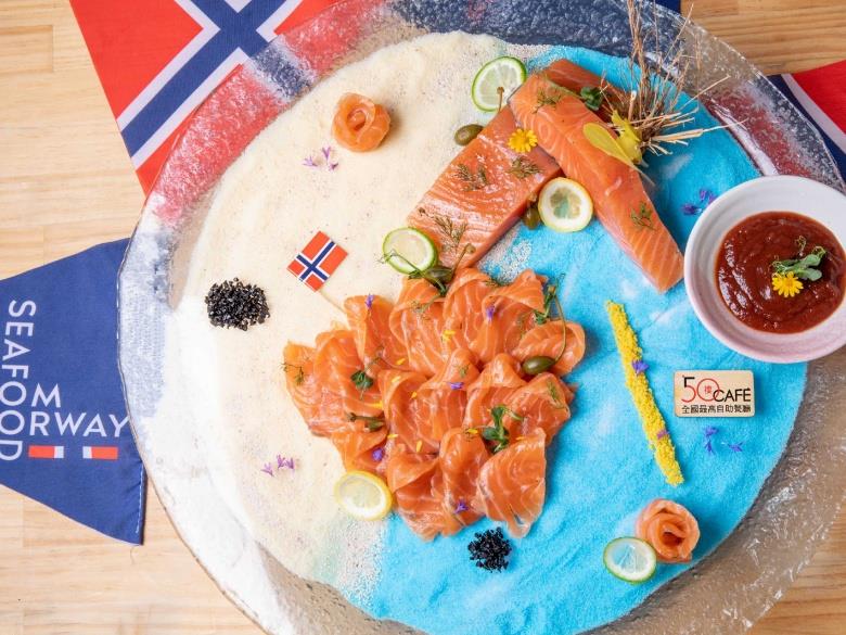 50樓Café自助餐廳:憑藉全國最高自助餐的無敵美景與海陸百匯,秉持「從產地到餐桌、安心上菜」理念,主廚採用大量蛋白與夏威夷火山鹽與各式香料包裹鮮嫩鮭魚後高溫烘烤,香料鹽烤外衣完整鎖住挪威鮭魚的細緻肉質與鮮美,蛻殼後再以炙燒逼出「爐烤火山鹽香茅挪威鮭」的油潤脂香,讓人唇齒留香!而另一道「古法香草油漬挪威鮭魚佐洛神花醬」更是展現挪威鮭魚與香草及花醬完美交融的精緻美饌。