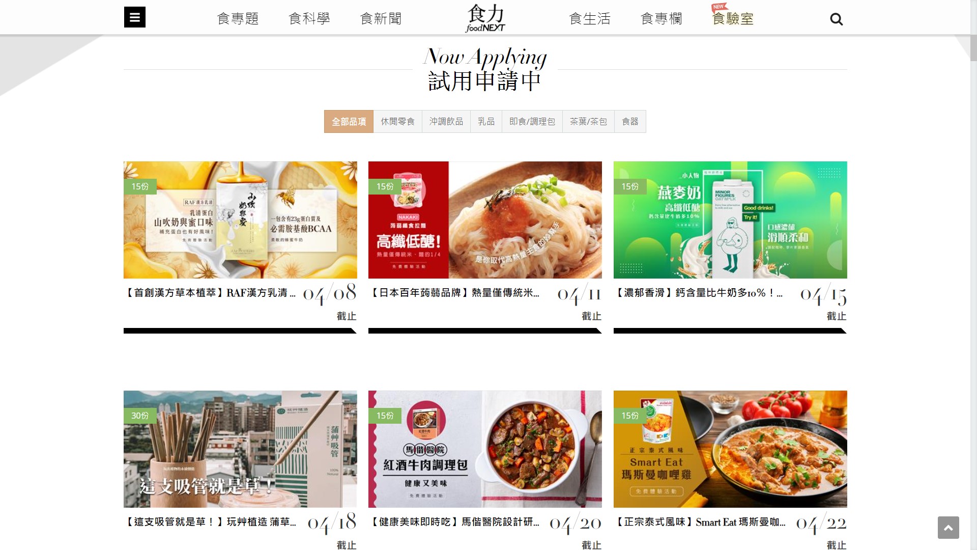 全台最大試吃平台「食驗室」的試吃產品多元,不僅有點心,更有水果、飲品、調理包或餐飲體驗等等,只要透過簡單兩個步驟:點入「食力」會員並完成註冊程序,在閱讀文章回答問題後獲取學分,之後就可以用累積的學分,挑選想要申請的「食驗室」試吃體驗活動囉!