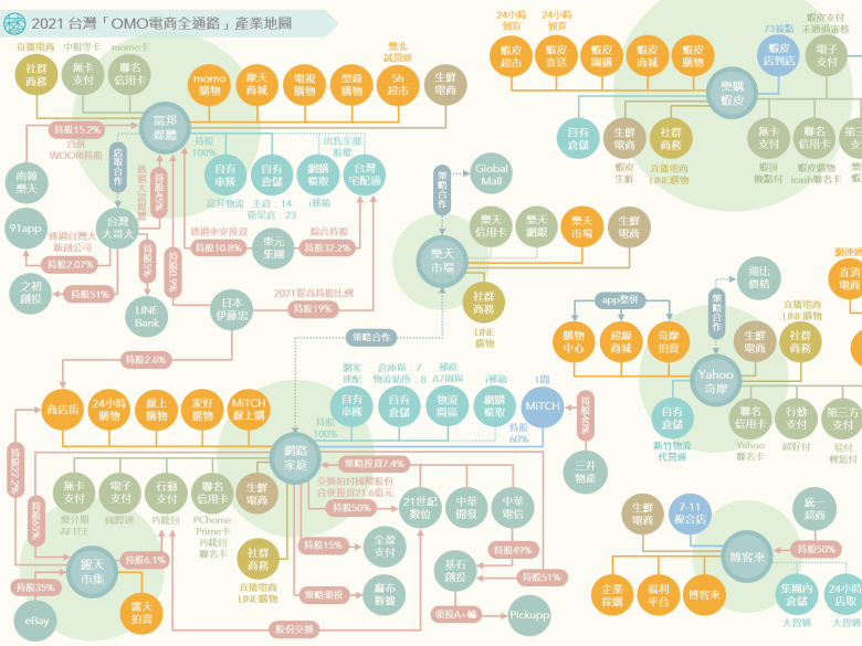 大型電商集團生態圈:擁有富邦與台哥大集團資源的momo購物,近年積極結合集團內金融、電信等優勢資源做為自有生態圈基礎。母集團台哥大2021年成為「Disney+」在台獨家合作電信營運商、以及投資91 app及LINE Bank等新興數位服務等舉措,都成為momo持續孕育生活服務生態圈的養分。而2018年投入自有點數發行的PChome,在整併支付連、國際連、Pi拍錢包後,截至2020年底Pi拍錢包會員數已突破百萬,P幣使用通路更超過18萬個店點。