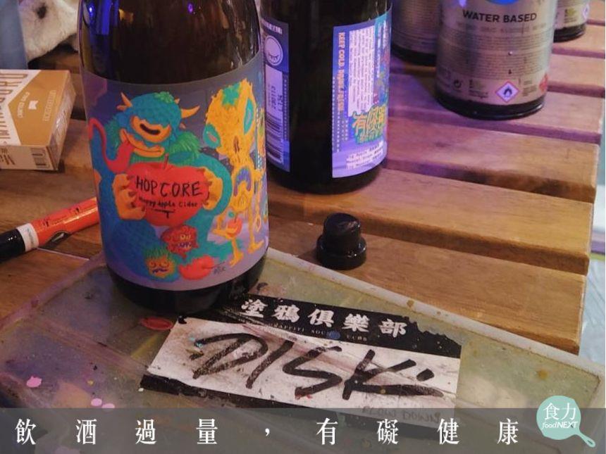 說到自己的故事靈感,Disk笑說在他想像的畫面中,有一隻異世界的怪獸入侵地球啃食大家的蘋果,如此天馬行空的發想正好契合酉鬼啤酒品牌特色,帶著故事性十足的塗鴉酒標,酸甜蘋果香氣的「有怪獸!酒花蘋果酒」才算是真正到位。