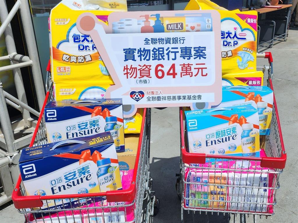 全聯慶祥慈善基金會捐贈愛心物資行之多年,於2023年8月12日捐贈超過64萬元物資於澎湖縣實物銀行,共捐贈高單價營養品3600罐亞培安素、800包成人紙尿褲、600罐沐浴乳、600罐洗髮精及200罐洗衣精等民生物資予當縣弱勢家庭及長者。