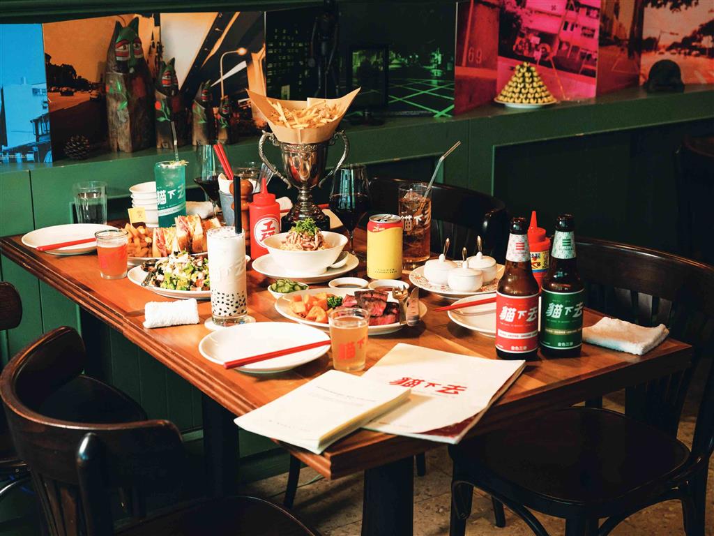 從現在看來這畫面實在是無從定義。但你知道這就是在貓下去。台菜未滿、西餐不足,什麼都是,也什麼都不是。有點像是ØZI與9M88的音樂結合體;有點像是喜劇諧星錢信伊(Ronny Chieng)在中國城烙英文講的笑話;有點那樣的味道。是中西美食,文化挪移,有點AI作圖的多重宇宙重置變換,但卻又是真有其人各形各色在裡頭大宴小酌,吃吃喝喝。