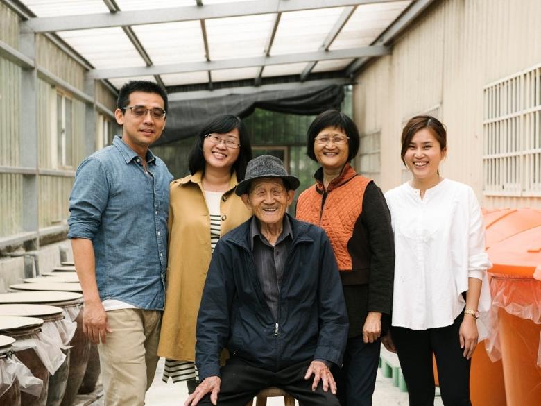 東興梅園創辦人,外公高萬祥(前排中),從初始就堅持採用有機方式栽種。第二代高美琤(右二)則創立品牌「祥記」,第三代謝育倫(左二)和先生(左一)與妹妹謝依潔(右一),則仿效祖輩守護著梅園的精神,陪伴守護長輩將心血延續。(圖片來源:祥記提供)