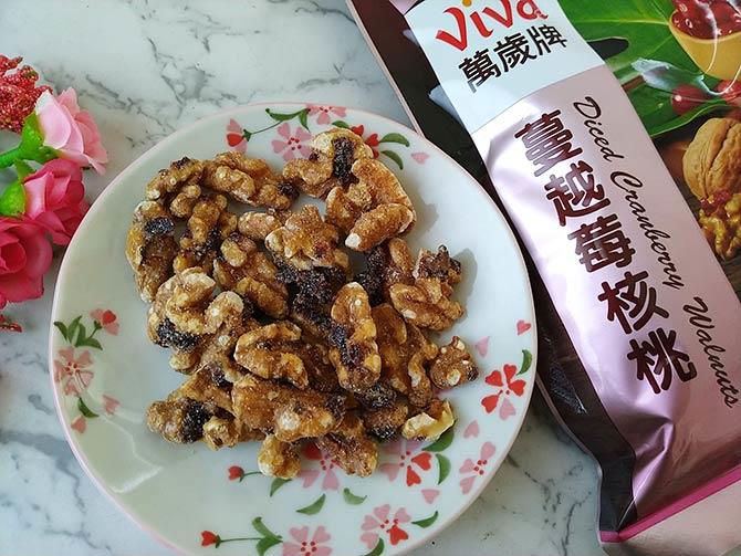 「萬歲牌蔓越莓核桃」採用特殊淋糖漿製法,能將蔓越莓果順利的接合在核桃上,食用上可謂一石二鳥,既保有核桃的脆度,不會因為糖槳使核桃變得濕軟,又同時擁有蔓越莓果乾的果香和Q感。