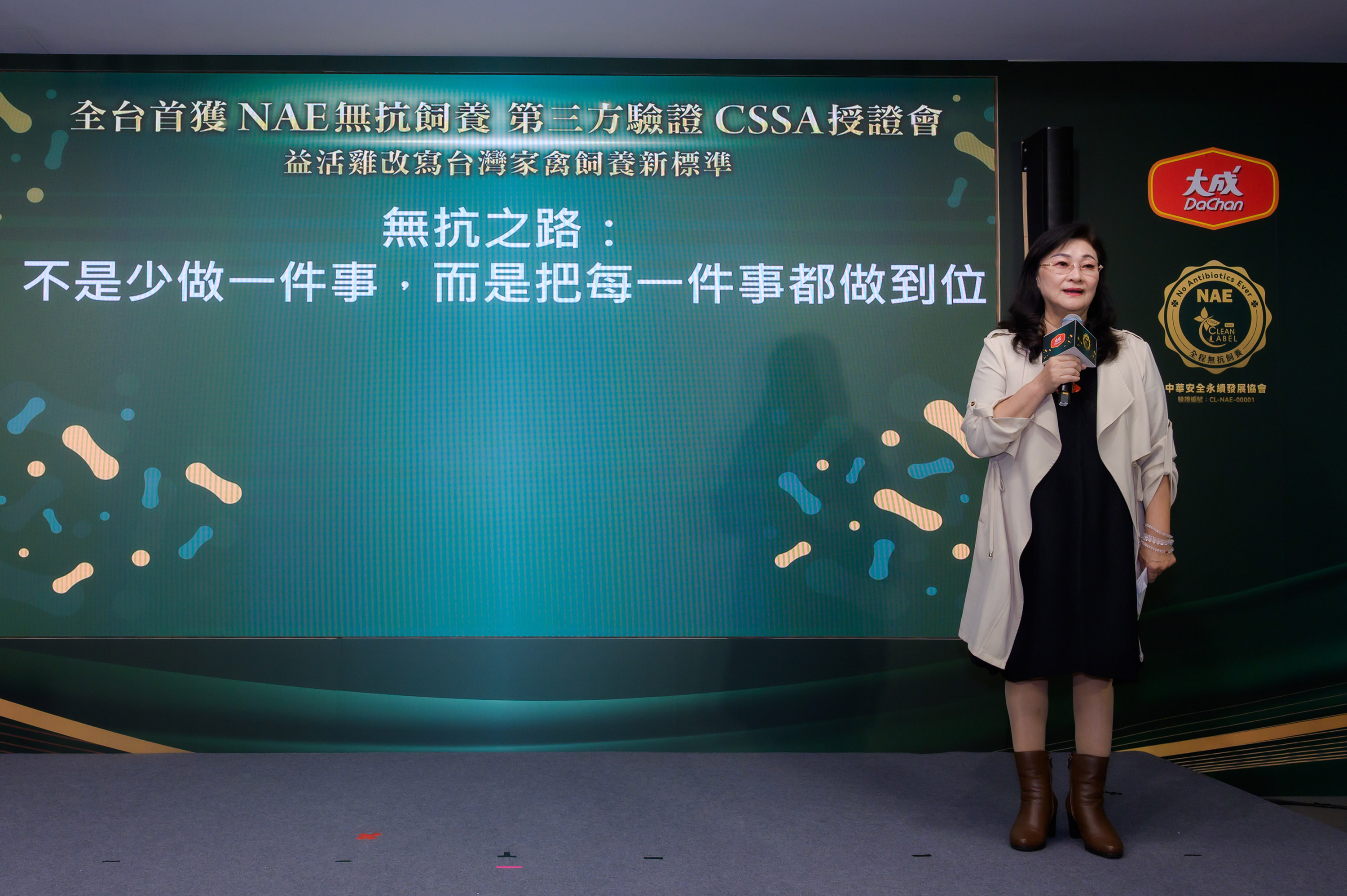 中華安全永續發展協會(CSSA)理事長黃乃芸博士表示大成良好的供應鏈管理完全符合CSSA無抗白皮書的要求。(圖片來源:大成集團提供)
