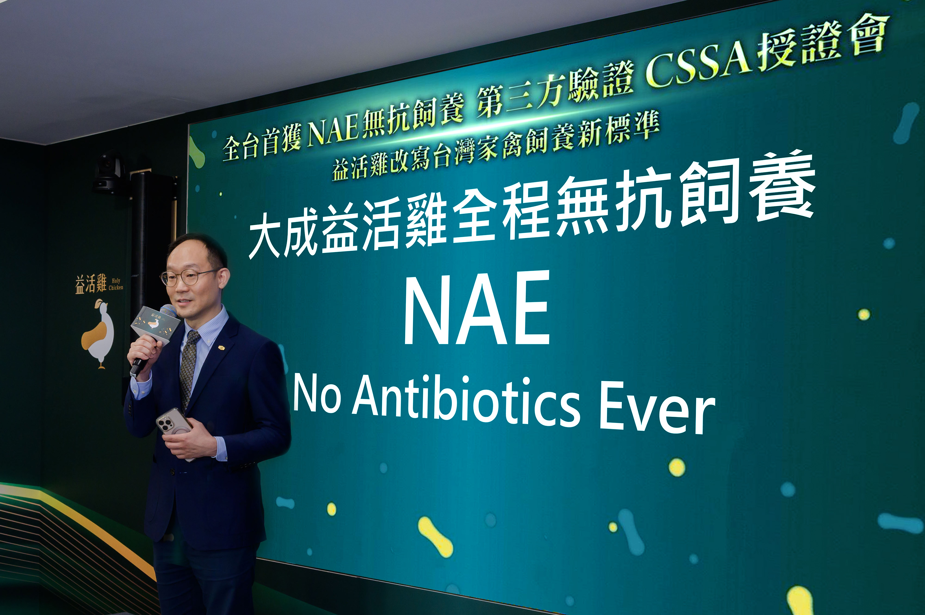 大成集團總經理韓芳豪表示,很榮幸能成為全台灣第一位NAE全程無抗飼養獲得CSSA第三方驗證的企業,證明台灣有能力建立與國際接軌的無抗飼養體系,全面提升食品安全、強化產業競爭力,並帶動肉雞產業邁向更健康、更永續的未來。為了打造全程無抗飼養的供應鏈,大成結合了動物營養、獸醫、養殖以及食品科學等專家共同從飼料配方、專利益生菌、飼養管理、生物安全等多方面著手提升雞隻的健康,以科學為基礎,逐步摸索出最適合台灣的無抗飼養模式,感謝團隊的努力,未來益活雞會持續擴大規模,並且推廣到各大通路。