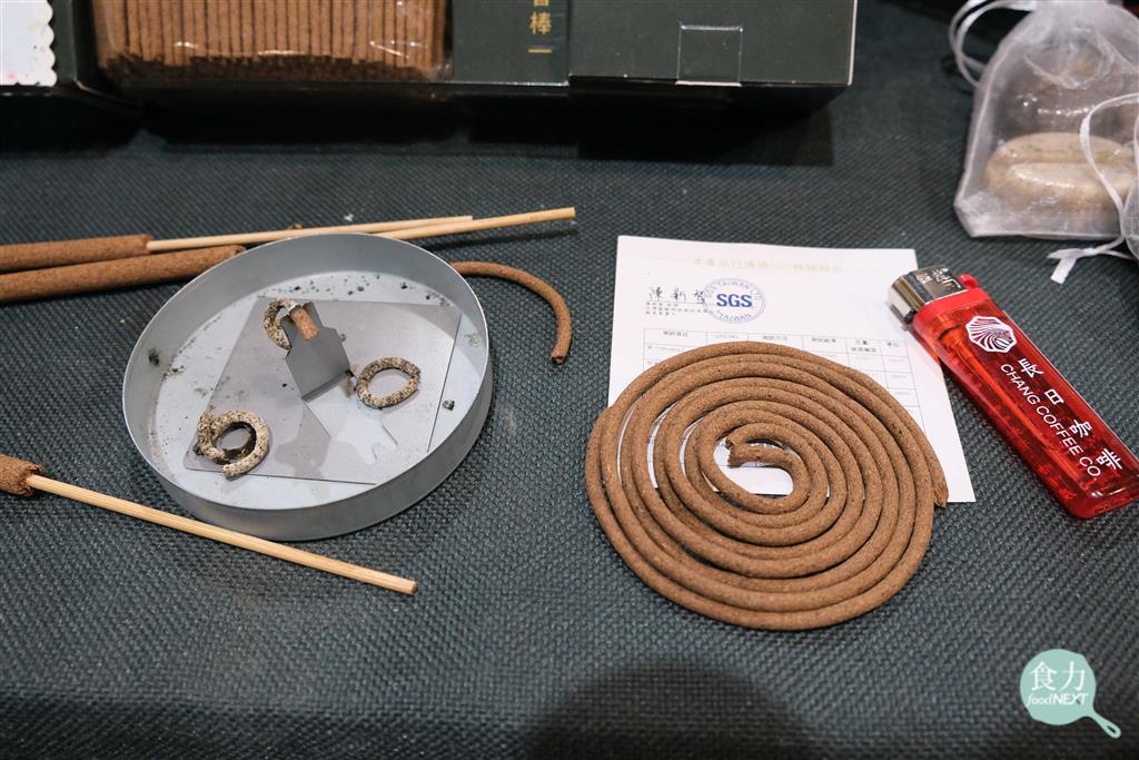 六邊形的柱狀體為咖啡渣製成的生質燃料棒,其炭化時間比傳統木炭短,且比傳統木材燒得更久;細長的驅蚊薰香棒則一支可燃燒4小時以上。(巫芷玲攝)