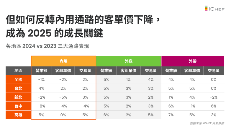 智慧餐飲科技公司iCHEF根據超過2億筆餐廳交易資料,觀察內用、外帶、外送等各通路的交易分析,發現餐飲業者營業額主力仍以貢獻超過60%的「內用」為主,比外送管道多10倍以上。然而,內用營業額在2024年營收表現衰退,iCHEF分析主要原因於交易單價與2023年相比,下跌了2%,如何反轉內用客單價下跌情形,將成為2025年餐廳營收成長的關鍵。