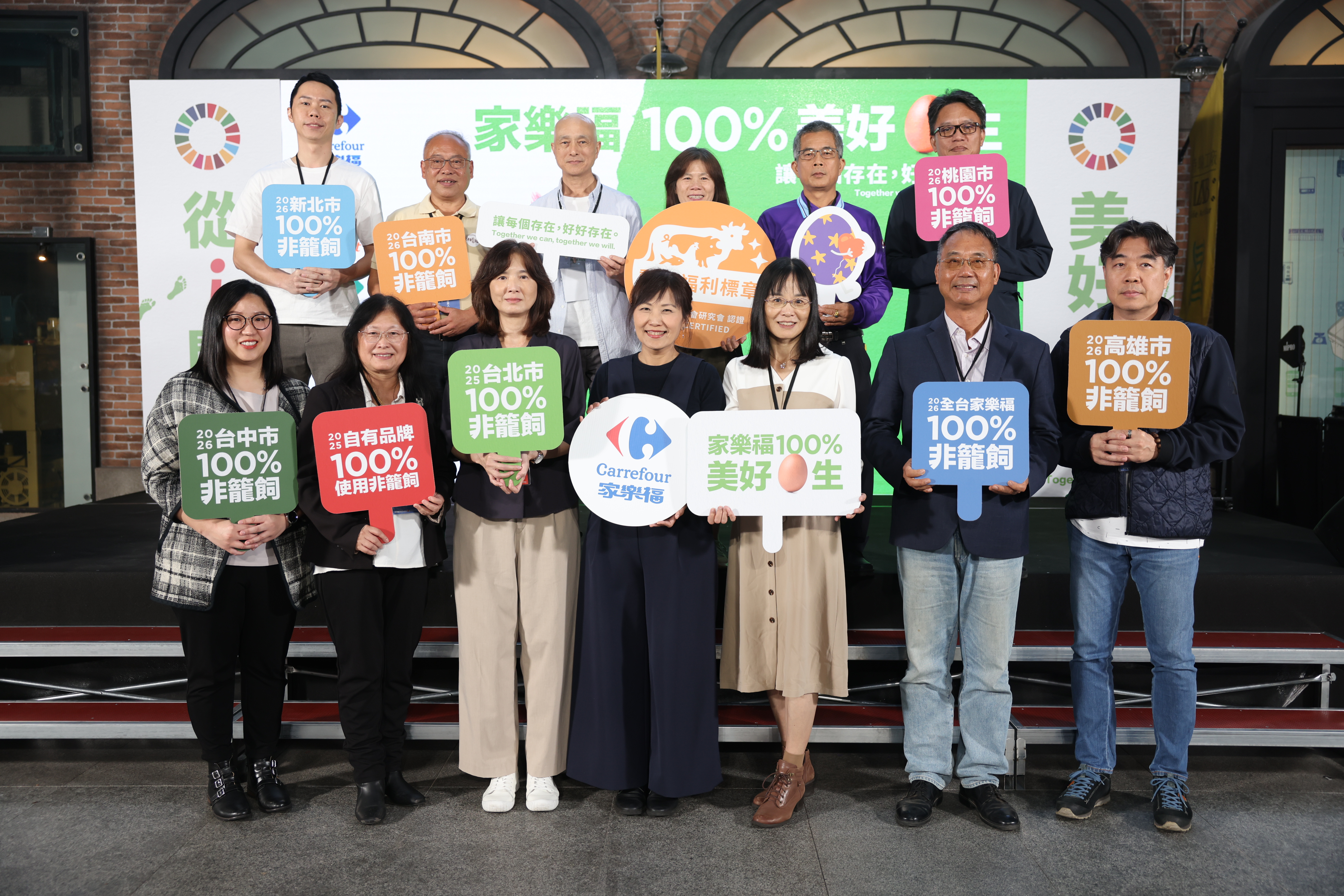 記者會由家樂福永續長暨文教基金會執行長蘇小真主持,由紙風車劇團以《雞城故事》歌舞劇震撼開場,傳遞象徵母雞終於獲得自由的呼喊,現場超過100位跨領域夥伴共同見證,包含環境部環境保護司司長徐淑芷、農業部畜產試驗所所長黃振芳、農業部動物保護司動物福利科科長石惠美、台灣動物社會研究會執行長朱增宏與副執行長陳玉敏、安侯永續發展顧問董事總經理黃正忠等都親自到場,見證這個耗時8年的重大成果。