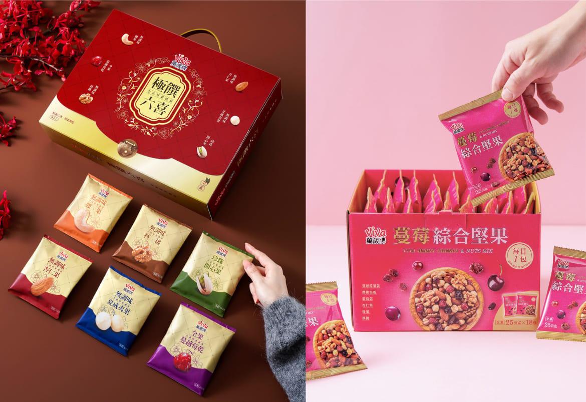 萬歲牌「極饌六喜堅果禮盒」及新品「蔓莓綜合堅果禮盒」同樣以多入小包裝呈現,抓緊消費市場對美味與便利的需求。(圖片來源:聯華食品提供)